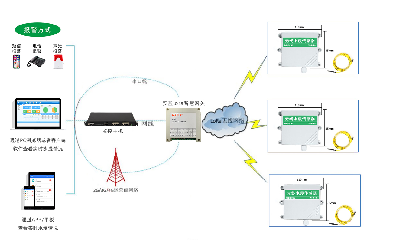 5.在瀏覽器輸入監控服務器的IP地址即可實時查看水浸情況。異常后電話短信郵件聲光報警。