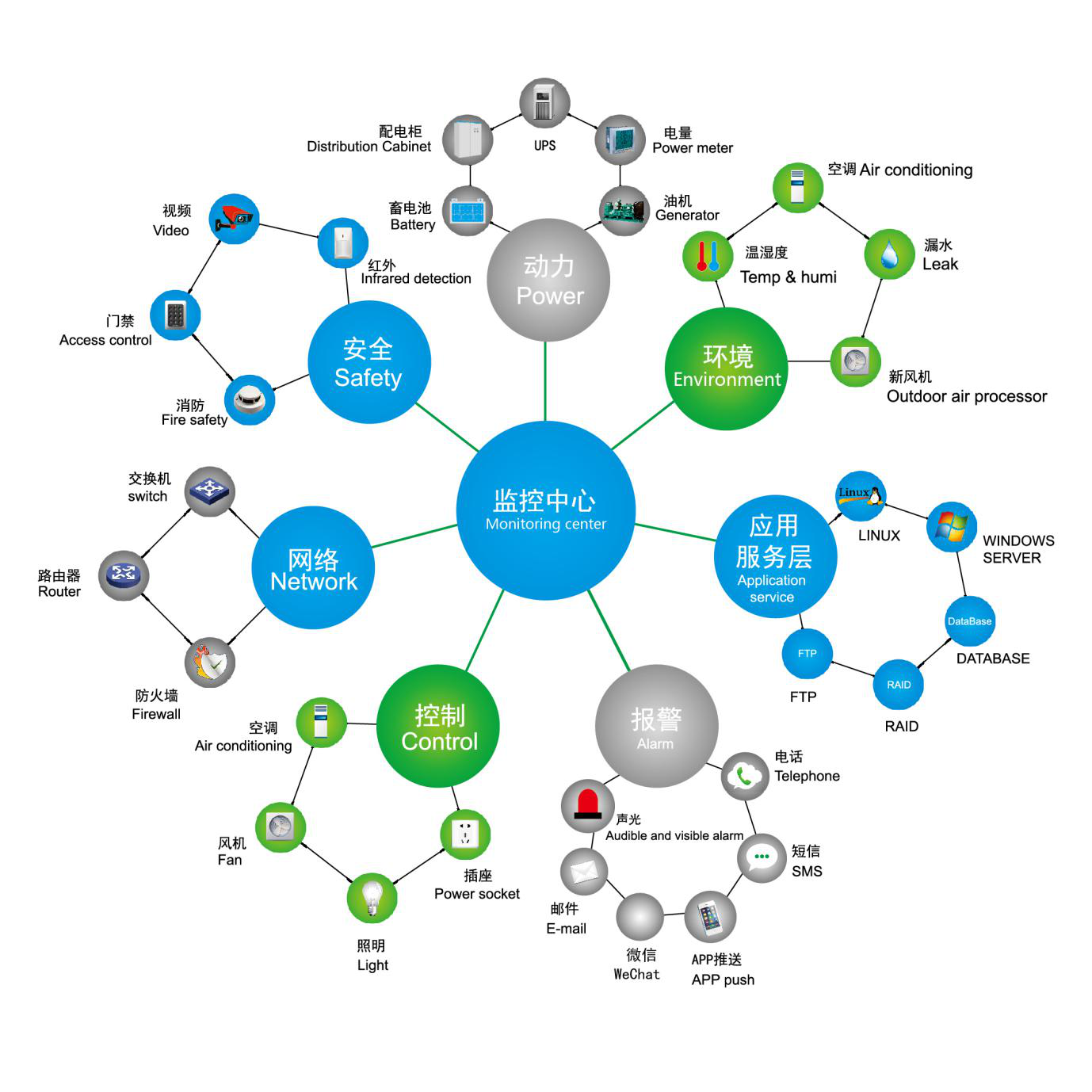 客戶需求:機房內精密空調監測,水浸監測,溫濕度監測;配電房蓄電池溫度、內阻、電壓、電流監測,UPS電流電壓功率因素等參數實時監測;消防系統、門禁系統視頻接入到動環系統。